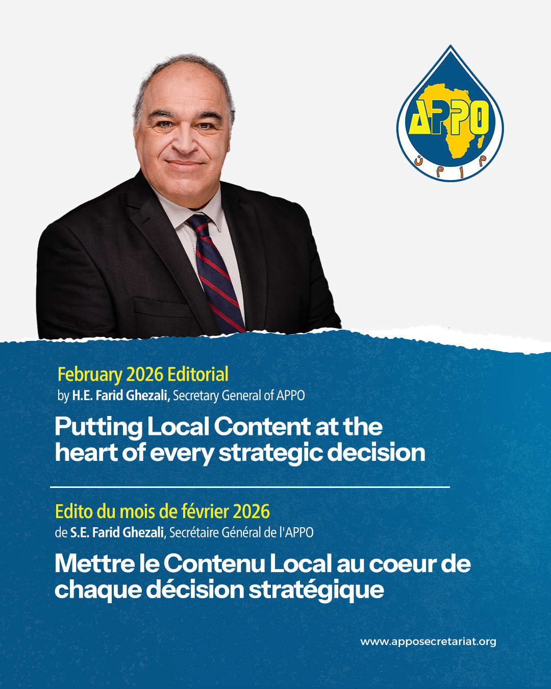Dear partners, APPO Member Countries and African energy stakeholders, after addressing the crucial challenge of financing oil and gas projects last month, I would like to place Local Content at the heart of our collective thinking today. In January 2026, as Africa consolidates its production at 7.8 Mb/d (+2.1%), Local Content is no longer an option: it is the strategic imperative that will transform our resources into sustainable prosperity for our nations. Let us move from rhetoric to concrete results.